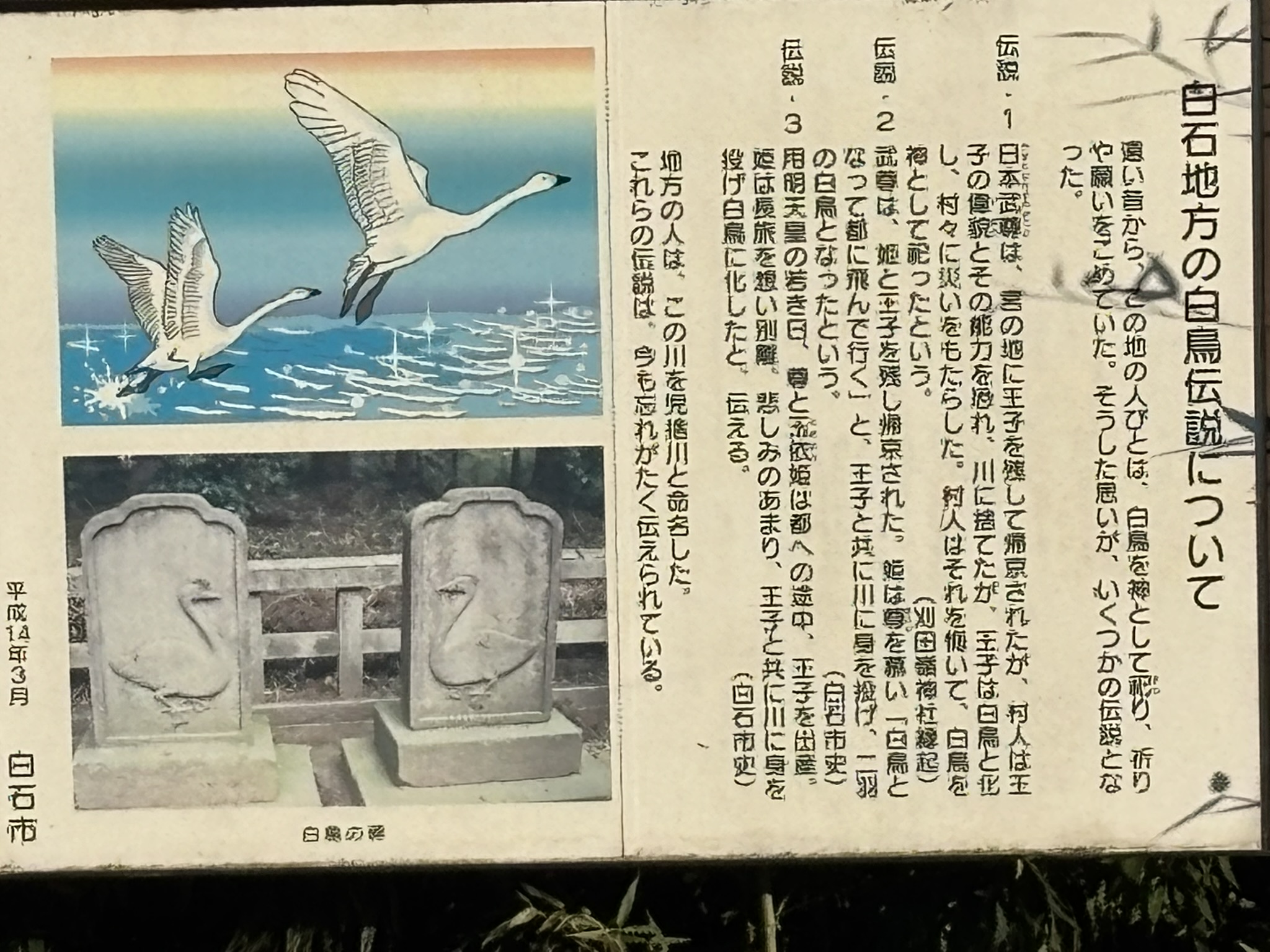 遠い昔から、この地のひとびとは、白鳥を神として祀り、祈りや願いを込めていた。そうした思いが、いくつかの伝説となった。 伝説1:日本武尊は、宮の地に王子を残して帰京されたが、村人は王子の偉貌とその能力を恐れ川に捨て たが、王子は白鳥と化し、村々に災いをもたらした。村人はそれを悔いて、白鳥を神として祀ったという。(刈田領神社縁起) 伝説2:武尊は、姫と王子を残して帰京された。姫は尊を慕い「白鳥となって都に飛んでいく」と、王子と共に川に身を投げ、二羽の白鳥となったという。(白石市史) 伝説3:用明天皇の若き日 皇子と玉依姫は都への途中、王子を出産。姫は長旅を想い別離 悲しみのあまり、王子と共に川に身を投げ白鳥に化したと 伝える。地方の人は この川を児捨川と命名した。これらの伝説は、今も忘れがたく伝えられている。 平成14年3月 白石市HP から