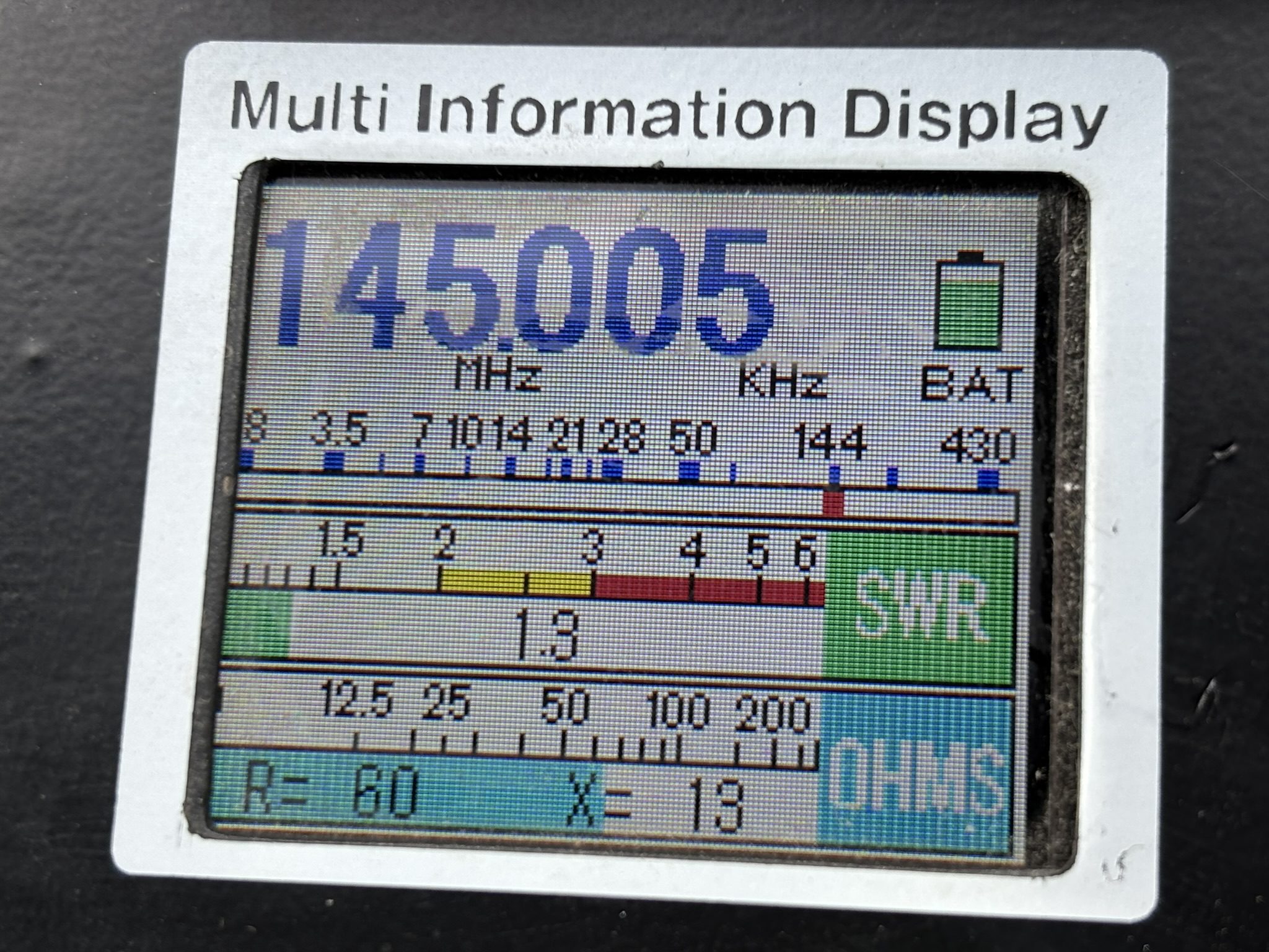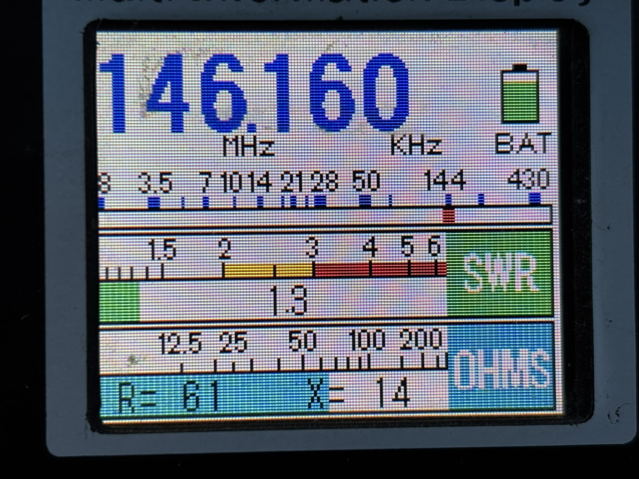 430MHzではインピーダンスが表示されていません。145MHzでもjX 値が増えています(51+j5)正確さに欠けるようですね。200MHz以下でダミーロード測定では50+j0になるはずですが?ずれていますね。