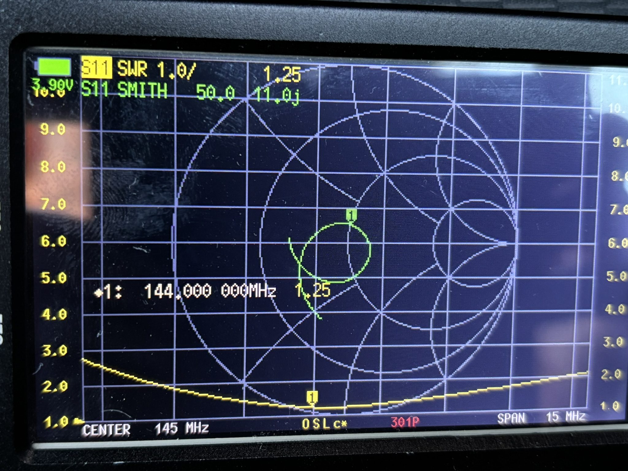 144MHz CAA-200 SWR1:1.3 インピーダンス値 Z=50+j15 NanoVNA SWR1:1.25 インピーダンス値 Z=50.0+j11.0