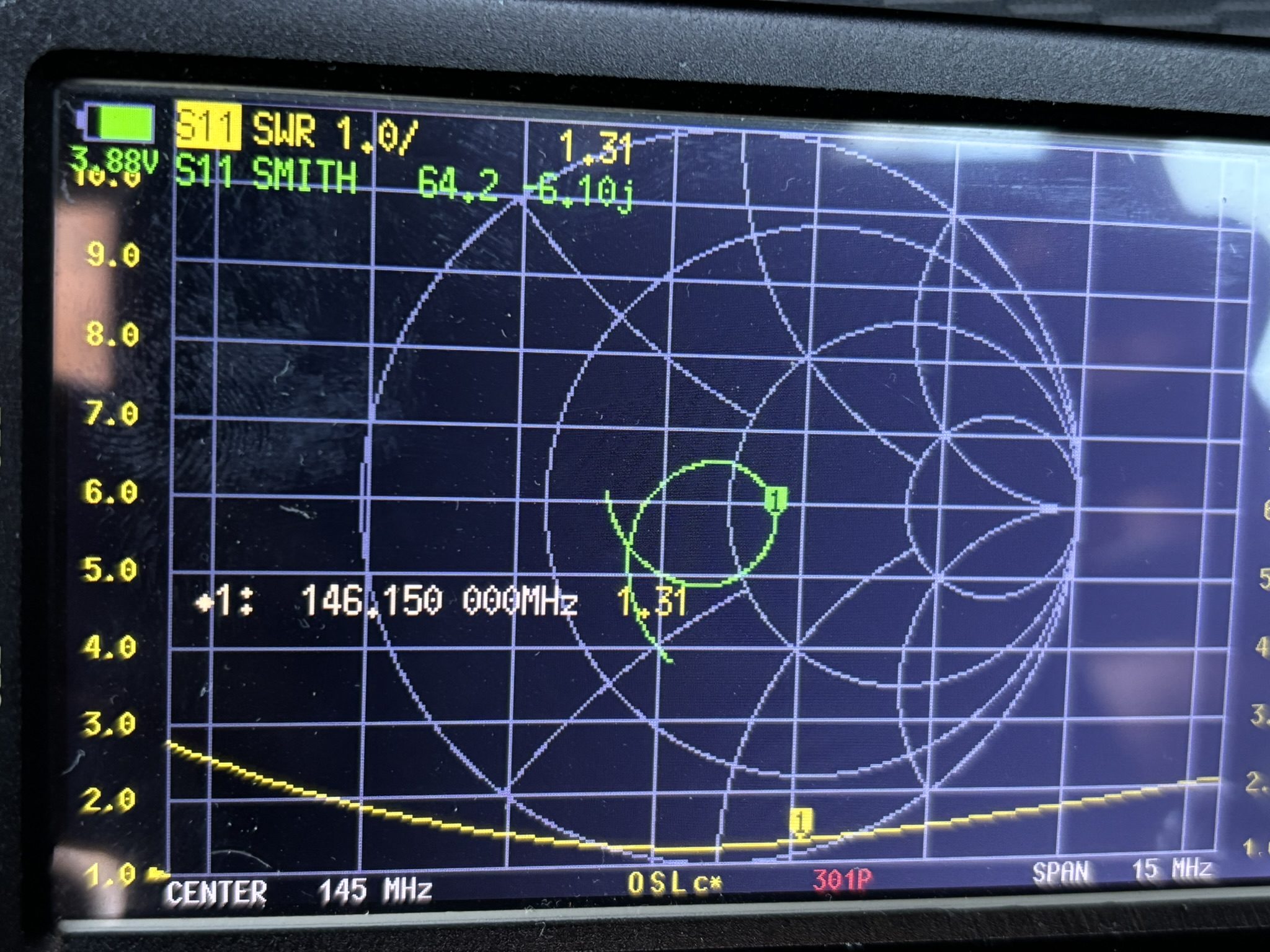 146MHz CAA-200 SWR1:1.3 インピーダンス値 Z=61+j14 NanoVNA SWR1:1.31 インピーダンス値 Z=64.2₋j6.10